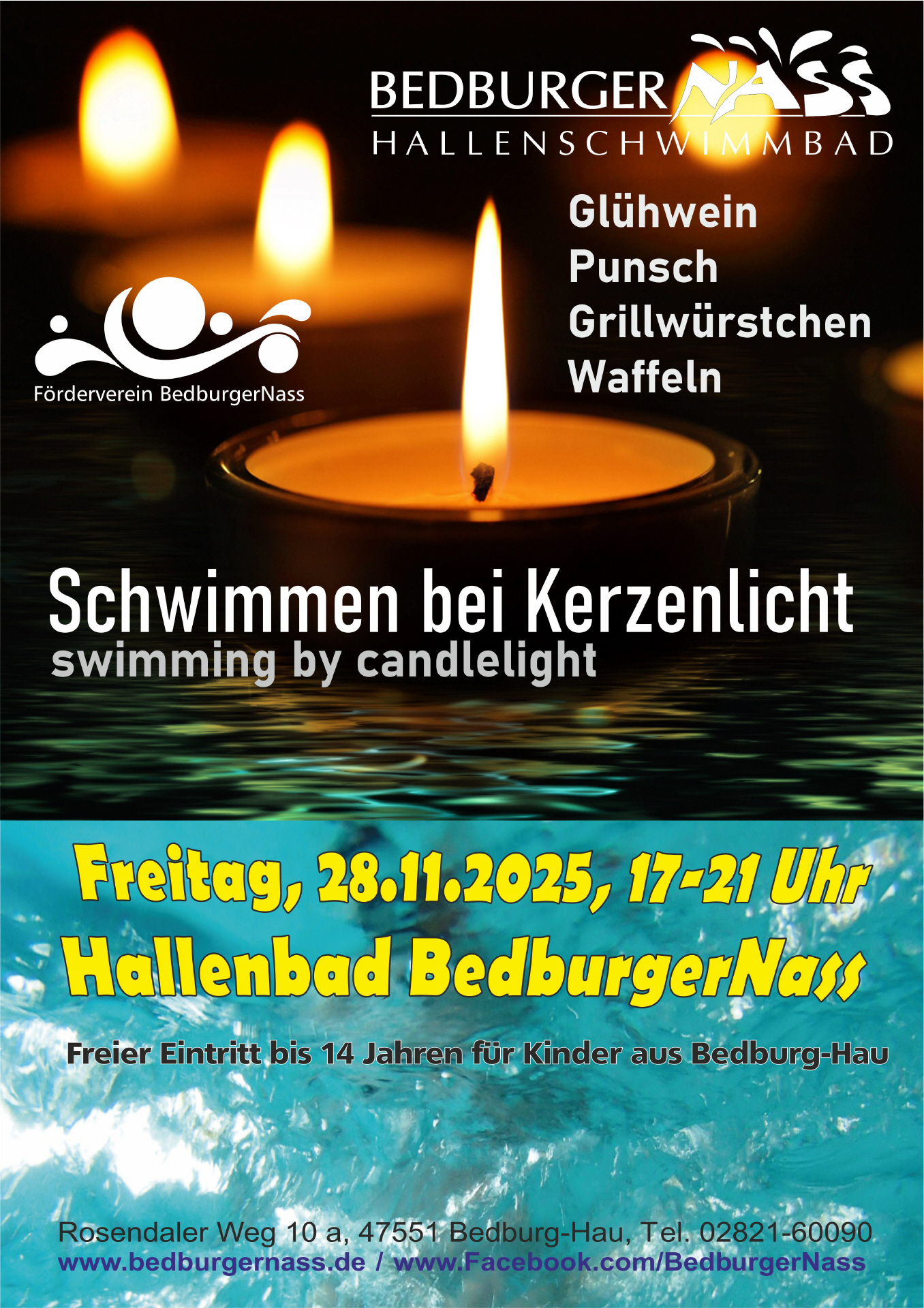 Mit tatkräftiger Unterstützung des Fördervereins veranstaltet das Hallenbad Bedburger Nass am Freitag, den 28. November 2025 von 17 bis 21 Uhr, ein "Schwimmen bei Kerzenschein".